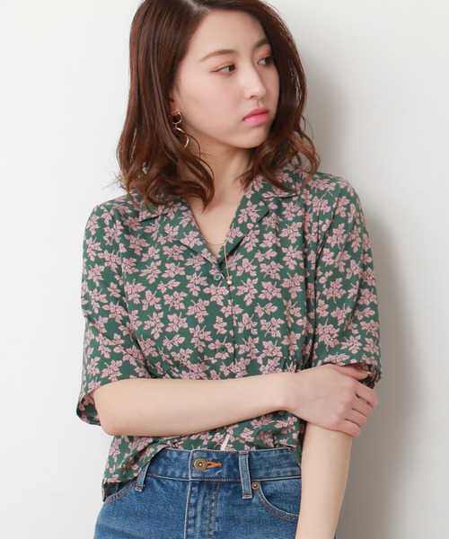 ヴィンテージライクな開襟ボレロブラウス。レトロ感のあるプリント柄とオープンカラーが旬なデザインポイントです。釦を留めてブラウスのように着こなしたり、羽織りも出来るアイテムです。ハイウエストボトムと合わせたり、デニム合わせでヴィンテージ感を現代にアップデートしたスタイリングを楽しめます。