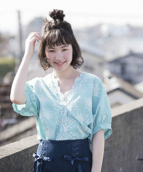 OLIVE des OLIVE 2018SS 襟元に華やかなスカラップ刺繍の入ったブラウス。 丸みのある袖のボリューム感も女性らしく、あえて肩から後ろに下げて着用しても今年らしい着こなしになります。 ギンガムチェック柄と無地の3色展開です。