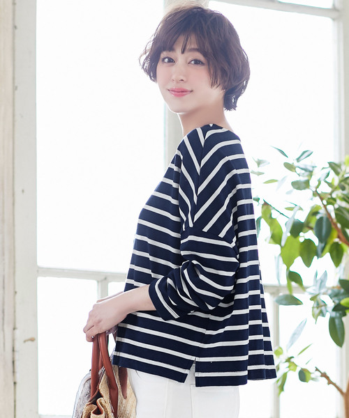 KOBE LETTUCE大人気アイテム・バスクシャツに新作登場!!ロングセラーのベーシックタイプ(品番:C1729)よりも春~夏向けの薄手生地となっております♪ゆるっとしたドロップショルダーが女性らしさを引き出してくれる長袖Tシャツ。ボーダー柄デザインは大人カジュアルなコーデにぴったり。ベーシックな細ボーダーから、カジュアルな太ボーダーまでカラバリ豊富にご用意しました。【素材・サイズ感】さらっとした肌触りの綿100%のカットソー素材を使用。綿ならではのくたっとした風合いが楽しめます。ゆったりシルエットで体型カバー効果が期待できます。首元はややボートネックのデザインで、カジュアルなボーダーも品よくまとまります。【スタイリング】デニムワイドパンツやスキニーパンツを合わせた大人カジュアルなコーデがオススメ。トレンドのトレンチスカートやカラースカートとの相性も◎どんなコーデにも合わせやすい定番トップスは1着あると便利です。