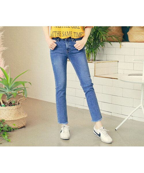どんなコーデにも合うデニムカラーの魔法パンツをご紹介します。部分部分のヴィンテージウォッシュ加工でポイントをプラスしました♡アンクル丈でトレンディなオシャレを楽しめます♬スリムなストレートフィットでレッグラインをカバー◎!デイリーにおススメのアイテムです。