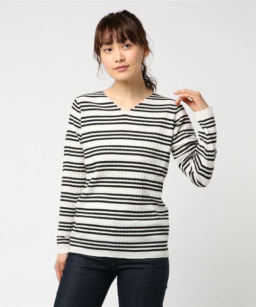 ボディラインにほど良くフィットするリブ編みで仕上げたニットプルオーバー。フェイスラインをすっきりと見せてくれるVネックは着こなしにメリハリを付けつつ、女性らしい抜け感を演出します。合わせるアイテムを選ばないので、デイリーに活躍できるアイテムです。色違いで揃えるのもおすすめです。