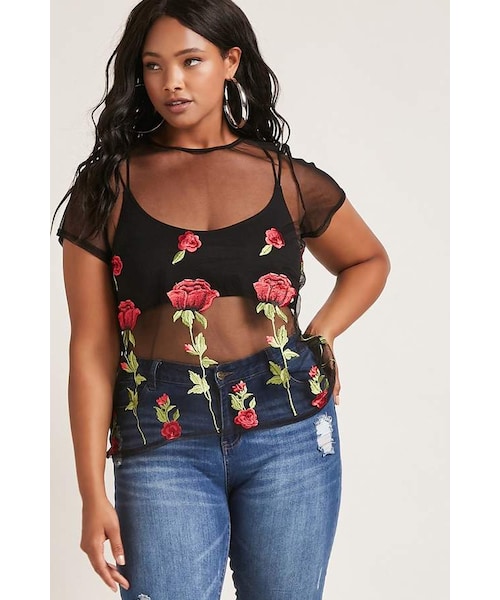 Details Forever 21+ - A sheer mesh knit top featuring front floral embroidery, round neckline, back button closure with a keyhole cutout, short sleeves, and a relaxed fit. Layering garments not included. - This is an independent brand and not a Forever 21 branded item. Content + Care - 100% polyester - Hand wash cold - Made in USA Size + Fit - Model is 5'11" and wearing a Size 1X - Full length: 25" - Chest: 46" - Waist: 47" - Sleeve length: 7.75"