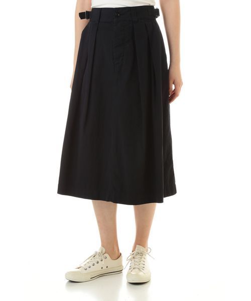 薄手ながらも膨らみがあり、張り、コシのある素材感のスカート。プリーツのあるボリューム、長めのバランスが特徴的。 ・ボタンフライ。
