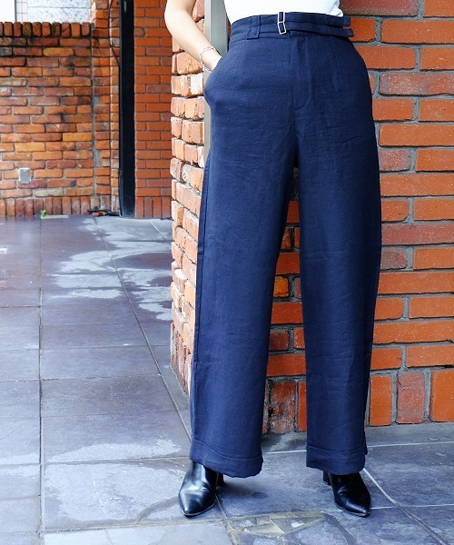 麻素材が涼しげなワイドパンツは、ウエストベルトが2本仕様になっているのがポイント。ウエスト位置が高めなのでインスタイルをすると足長効果は◎フルレングスのワイドシルエットがカチッとし過ぎずラフに着用して頂け、合わせるアイテムで雰囲気が変わります。カジュアルにプリントTシャツにスニーカーでも、シャツをインスタイルにして綺麗目にしても◎