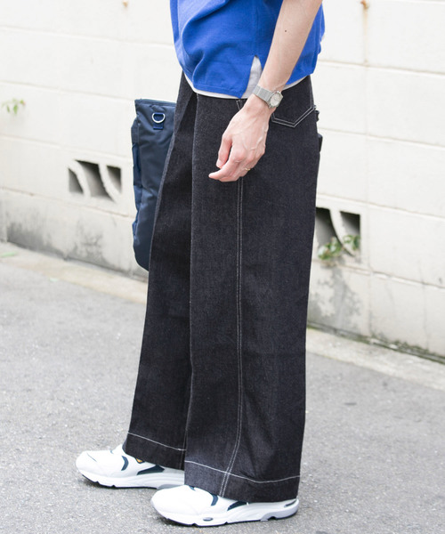 80'sのDCブランドの一本のような、革新的で絶妙なモード感を纏ったワイドデニムパンツ。 センタークリースの入ったスタイリッシュなディテールに、あえて配色のステッチを施しています。ストッと落ちる極太ストレートは、ボリュームのないローテク・スニーカーで合わせるのが正解。 ※この商品は、インディゴ染めを施しています。 着用中の摩擦や汗により、色落ちや色移りする可能性がありますので、ご注意ください。 また、日光や照明などに長時間当たると変退色することがありますので、ご注意ください。 ※その他お取り扱いに関しましては、商品に付属のアテンションタグをご確認の上、充分ご注意ください。