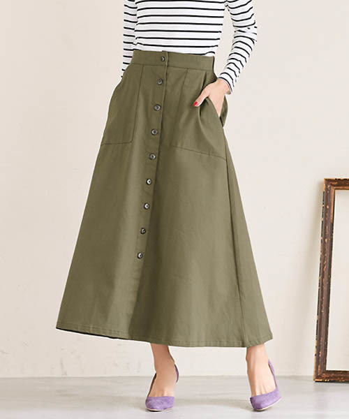 今季押さえておきたい“フロントボタンロングチノスカート” 【素材】 綿混素材を使用することでサラッとした着心地を叶え、 素肌にも優しく、程よいハリ感もあるため綺麗なシルエットをキープ。 【デザイン】 今季一枚は押さえておきたいフロントボタンデザインのスカート。 程よく広がるシルエットがレディライクな印象を与え、 ロング丈ながらもフロントスリットで、足さばきが楽なのも嬉しいポイント。 ・ボタンフライ。