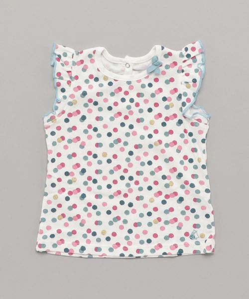 「第二の肌」と呼ばれるやわらかな肌触りの1x1リブ編み素材を使用した半袖Tシャツ。夏の太陽に良く似合うカラフルな色遣いのプリントに、フリルの袖がキュートな印象です。ネックラインのリボンがアクセント。後ろスナップでお着替えも簡単です。