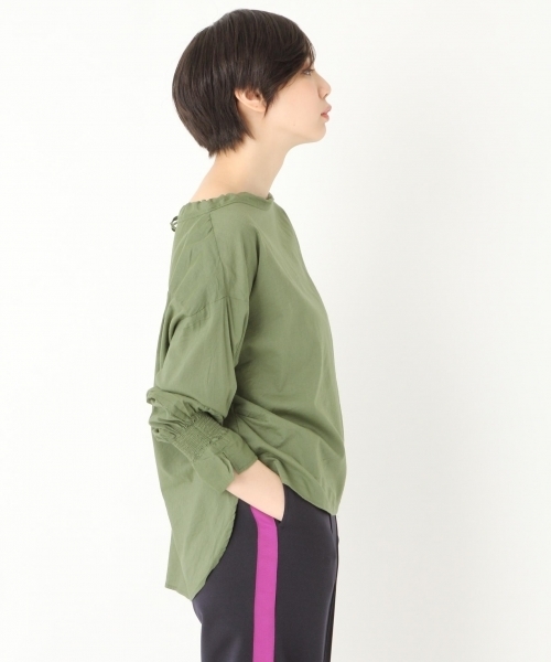袖口やトレンドの後ろリボンなど、ディテールに可愛いポイントが詰まったボートネックブラウス。 サイドの部分をくしゅっとさせるなどシルエットにもこだわり、一枚でさらっと着ても決まる便利なアイテムです。 夏らしい涼しげで明るいカラーバリエーションが見ているだけで気分も上げてくれそう。 レーヨンのやわらかさと、コットンの軽やかなハリ感の良いところ取りな素材感も◎