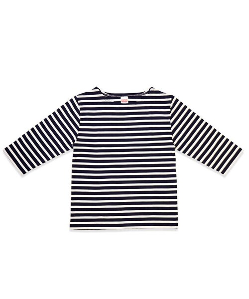 ボートネックタイプの"ヘルスニット"天竺ボーダー7分袖Tシャツです。 ベーシックなボーダー柄デザインのロングボーダーTシャツは、1枚での着用はもちろんのこと、重ね着のコーディネートにも大活躍する1着。 コットン100%で伸縮性のある天竺素材を使用しているので肌触り・着心地がとても良いロングカットソーです。 ワードローブに揃えておきたい、丈夫で長く着続けられるアイテムです。