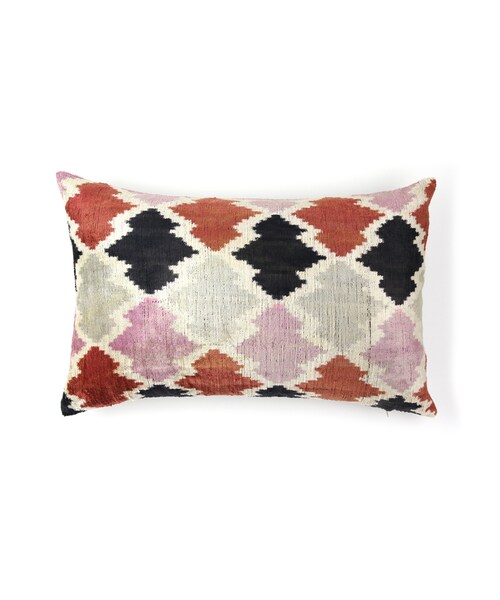 イカットの大胆な色使いと柄のクッションカバーです。空間に斬新なアクセントを与えてくれます。ウズベキスタンで職人が丁寧に織り上げる生地は、1日に1平方メートルしか織ることができず、大変手間がかかっています。表は滑らかな肌触りのシルクベルベット、裏はさらりとした麻で、シーズンを通してお楽しみいただけます。同種の柄違いのアイテムと合わせても表情ある空間になりおすすめです。イカット柄のすべてのクッションカバーはこちらからご覧ください。中材は別売りとなっております。