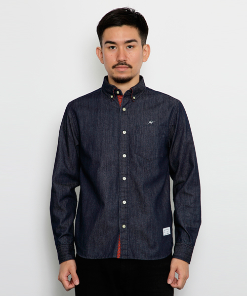 濃色・淡色2色展開のボタンダウンデニムシャツ。衿裏・カフス裏・ヨーク内側・前立て裏・ケンボロ裏に別布を当てアクセントにしている。ダークインディゴはレジメンタルストライプ、ライトインディゴは無地のシンプルデザイン。 model:身長172cm 着用サイズ:M