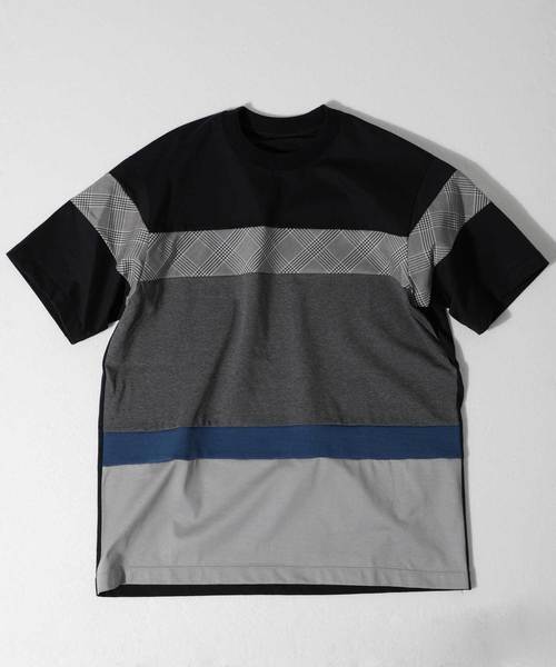 異素材を組み合わせたデザインカットソー。ベースの素材はコットンの40双糸を今まで出来なかった最大限のハイゲージで編んだ天竺をシルケット加工で仕上げています。 カジュアルになりがちなコットンの40双糸天竺を最大限に度目を詰めた事によって、綺麗さを兼ね備えた素材です。 それに合わせて、チェック生地とミラノリブを使用しており、考えに考え抜いた配色と切り替えのバランスでデザインしています。 一枚でインパクトがあるのでボトムはシンプルに合わせたスタイリングがオススメです。