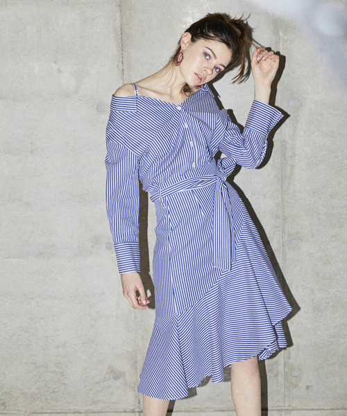 大きなラッフルが引き立つ大人かわいいデザインスカート。共地リボンでウエストマークやアシンメトリーヘムがデザインポイントになり、女性らしいバランスで穿けます。トレンドのカラーニットを合わせた単品使いもできますが、同シリーズのブラウスとワンピース風にも着られます。・ファスナー有り。・裏地有り。