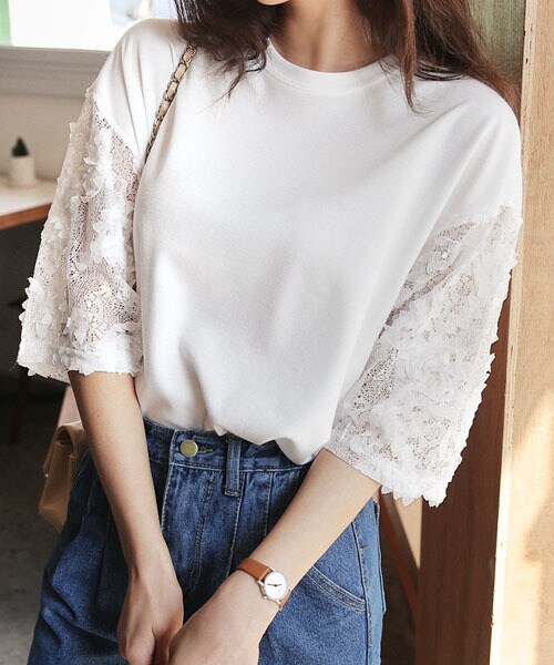 肌をほんのり透かすフローラルテクスチャーのスリーブデザインが魅力のTシャツ♡コーデを華やかな印象に仕上げてくれます♪ デニムパンツに合わせてデイリーにお使いください^^ ※WEARに記載してある金額と、DHOLIC通販サイトに記載してある金額にシステム都合上、稀に誤差が生じます。正しい金額はDHOLIC通販サイトに記載された金額です。