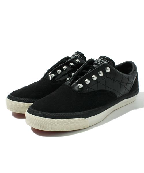 人気アパレルブランド『VANQUISH』とのコラボレーションモデル。 左右非対称の素材使いやハトメ飾り部分のスタッズ、インソールのレパード柄など、バンキッシュならではのこだわりあふれるスキッドグリップ。 レッドカラーのアウトソールもポイント。