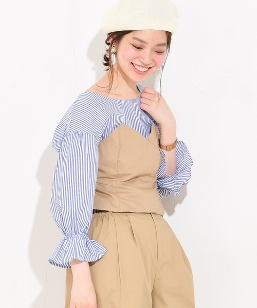 【2018SS natural couture】1枚でオシャレ上級者♪重ね着風ブラウス♪涼しげなブラウスに重ね着風に見せてくれるビスチェが付いたブラウス。ウエスト部分は幅広めのシャーリング仕様なので、腰まわりをすっきりと魅せてくれるのも嬉しいポイント♪デニム合わせはもちろん、セットアップ風に着ればトレンド感のある垢ぬけコーデの完成です。ハリのあるビスチェ部分には共地のリボンが付いおり、前後どちらで結んでも◎1枚で主役級の華やぎトップスです♪