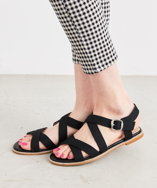 ダブルクロスベルトで足元にインパクトを与え、グリッターラインでほどよく抜け感を演出したアイテム。モードカラーも目の細かいキャンバス地でナチュラルに仕上げハード過ぎない印象に。グリーンはリゾート柄を使用し夏の足元が楽しくなる1足は旅行にもぴったり。 【オススメPOINT】 ◇煌びやかなグリッターラインが足元のアクセントに ◇キャンバス地な為足当たりがソフト ◇オフホワイトよりなので脚馴染みしやすい
