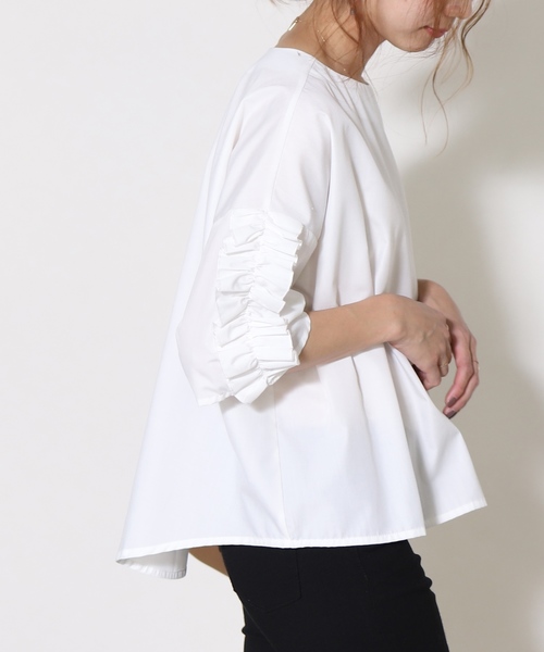 袖のさりげないフリルが大人可愛い ”大人のフリルカットソー” 1枚でさまになる袖フリルカットソー! 袖の長さも短すぎず二の腕が隠れるくらいの長さに調節しました♪ なだらかな開き具合のネック部分で涼しげな印象&大人な印象に。 また、タイトすぎないシルエットでインスタイルにもアウトスタイルにもOK! なんといっても嬉しいプチプライス☆なので色違いでワードローブに揃えてみるのもオススメです♪ ☆スタッフおすすめポイント☆ フロントを少しインしたスタイルで全体にふんわりボリュームを持たせる着こなしがこなれ感満載でオススメ♪ カラバリも豊富でSNS映え間違いなしのアイテムです♪ ※グレーは青みがかったお色になります。ディティール写真が実物に近いお色となります。 【生地感】 コットンミックスのややハリのある素材を使用しシルエットの出やすいデザインに。 ※モデル着用写真は撮影環境により、多少実際のカラーと異なる場合がございます。予めご了承をお願いいたします。 ※生産時期により、生地の風合い(シワ加工・ハリ感など)が異なる場合がございます。