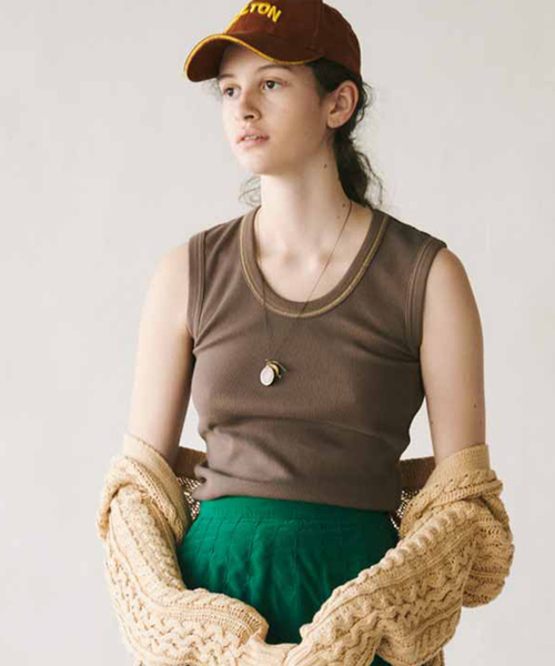 「ワッフルの着心地に金糸のステッチ」ミリタリーの肌着、サーマルのようなしっかりした厚みのワッフル素材を使用。あせたカラーがヴィンテージ感のあるコーデになじみます。幅狭で深い開きのUネックが女っぽく、ステッチを金糸にすることで、さりげない着映え感も。着こなしやすい前後差のあるロング丈です。