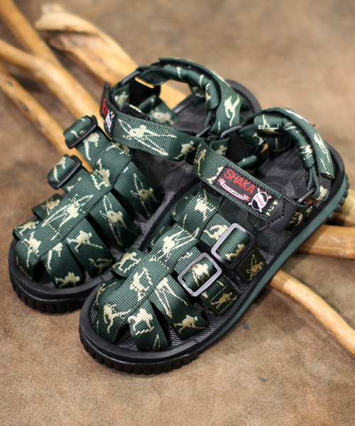 【HIKER】 SHAKAの代名詞的MODELのHIKER。 特徴は足の甲を包み込むようなストラップで、まるで亀の甲等のようなデザインです。 このデザインを元に生産するブランドも数多くあります。 ソールのクッション性、グリップ力は抜群です。 軽量で独特なソールの反りは足に見事にフィットし魅了される事間違いなし。 また足首、踵、甲の部分をベルクロで調整する事が可能で様々な足の形にフィットする万能なスポーツサンダルです。 ●快適な履き心地 90年代当時のソールを基に、軽量化されたソールは、クッション性・耐久性も向上しています。 従来の欧米規格を見直す事で、全体のフィット感が増し、歩行時の負担が軽減されました。 ●高機能をファッショナブルに シンプルなデザインなので、耐久性・快適性に優れたアウトドアアイテムを日常的に楽しめます。 スニーカーとも一線を画す、新たなカジュアル・シューズとしての提案です。 ●もちろんアウトドアにも 水陸両用でお使い頂けるので、海や川でもお使いいただけます。 スニーカーで使用されるEVAミッドソールや、グリップ力・耐久性に優れたアウトソールを採用し、アクティブなシーンにも活躍します。 【 SHAKA / シャカ 】 1990年代に実在した南アフリカ共和国のサンダルブランドです。 南アフリカ国内の自社工場にてハイクオリティーで独創的なデザインのサンダルを製作しておりました。 アフリカの伝統的な柄や色使いを取り入れ、当時のトレンドであったナイロンウェビングを使用したスポーツサンダルは90年代後半に日本でも多く販売されました。 アウトドアブームも追い風となってブランドとして認知されはじめましたが、2000年前半にSHAKAは惜しまれながらブランドが消滅してしまいました。 そして十数年の時が過ぎ、2013年春、遂にSHAKAが復刻となりました。 当時のアーカイブより、SHAKAの特徴であるソールの形状、発色の良いナイロンテープはもちろん、プラスチックパーツや アーチの角度まで忠実に再現する一方、ソールの強度やクッション性、足入れ等の向上をはかり、現代風になった進化版のSHAKAをお楽しみいただけます。 【SIZE】 5 → 23cm 6 → 24cm 7 → 25cm 8 → 26cm 9 → 27cm 10 → 28cm