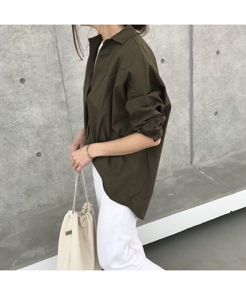 深めのVネックで大人なぬけ感漂うスキッパーシャツです。 落ち感あるドロップショルダーに、ルーズなフォルムが魅力の1枚♪ スモックっぽくカジュアルに着たり、ボトムINでメリハリを付けるのもおススメです☆ 袖をロールアップして、ラフに着崩すのも◎ どんなテイストにもハマるロングシーズン着回しできるマストアイテムです!! ※モデル身長161㎝ ◆クリックポストにて代引きをお選び頂いた方は、390円プラスさせていただき、ゆうパックの代引きにて発送させていただきますのでご了承下さい。 ◆カラー ホワイト、カーキ、ストライプ ◆サイズ 着丈:(前身頃)68cm(後身頃)76.5cm 身幅:64cm、肩幅:66cm 袖丈:40cm、袖口:11.5cm 裾:64.5cm ※多少の誤差は予めご了承下さい。 ◆素材 カーキ・ホワイト:ポリエステル65% 綿35% ストライプ:綿100%