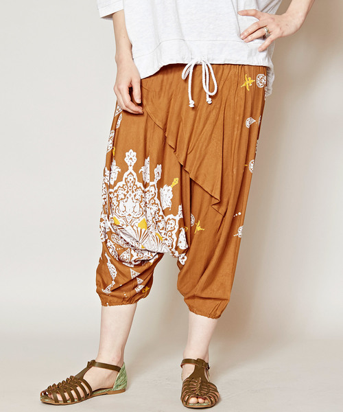 美しい曼荼羅模様をプリントで大胆に表現した、ひざ下丈のクロップドサルエルパンツ。サイドに流れるように効いたドレープが個性的。夏のエスニックスタイルにおすすめのアイテムです◎ ※こちらの商品は1点1点職人による手作りとなります。その為、生地の取り方により柄の配置や形・色合いなど若干異なる場合がございます。あらかじめご了承ください。 Amina Collection Co.,LTD.