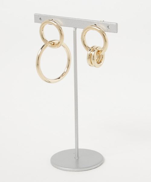 左右でリングのつき方がアシンメトリーになっているピアスセット。メタルカラーでシンプルなデザインなのでコーデを選ばず、デイリーに使い回す事が出来るアイテムです。