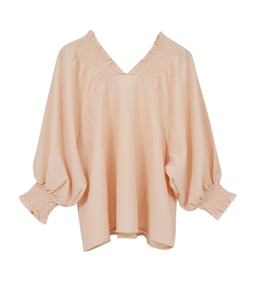 ボリューミーな袖シルエットとシャーリングネックがポイント☆ ドレープ性のある生地を使い上品な印象に! ほんのり透け感があるのが女性らしい一着です♪