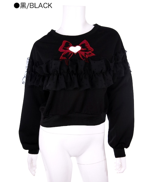 ♡Bobon21 2018Spring New Collection♡ Sweetなリボンハートフリルトップスの新色登場 フロントリボンデザインの刺繍+ハートくり抜きデザイン 全体に大きなシフォンレースをプラスして 背中はボタンデザインとKAWAII要素たっぷり ゆったりシルエットで合わせやすいのはもちろん ボリュームがあって遊び心のある目を惹く1枚 新色<黒>、白、ピンクの3色展開
