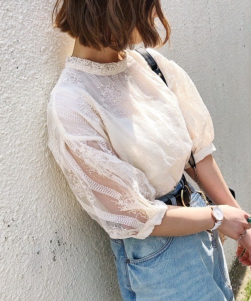 【SNSでも話題のレースブラウスがついに入荷!!】 ヴィンテージライクなレースをたっぷり使ったブラウスです。 これからの時期に着やすい五分袖。 袖のレースから肌がキレイに透けて上品な印象に。 今年マストなボリューム袖もポイント。 ◆おすすめコーディネート◆ 1枚できるのももちろんかわいいですが、 ビスチェとのレイヤードスタイルがおすすめ。 一気に垢抜けた表情に。 これ1着で色んなスタイルが楽しめます。
