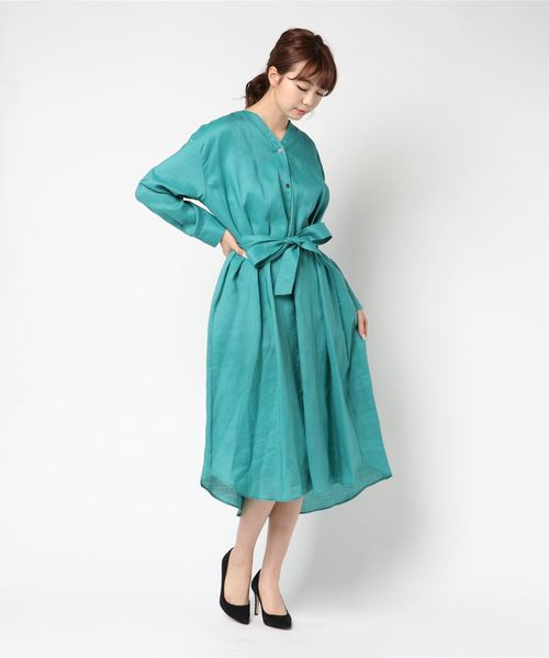 トレンドのノーカラーとリネンのこなれ感が、モードで洗練された雰囲気を演出してくれるワンピース。 軽く柔らかい素材で、リラックス感のある涼しげな着心地になっています。 程よいボリューム感があり、1枚でお洒落に決まるシルエットも魅力的。 ウエストマークと抜き衿で、トレンドライクなスタイルが楽しめます。