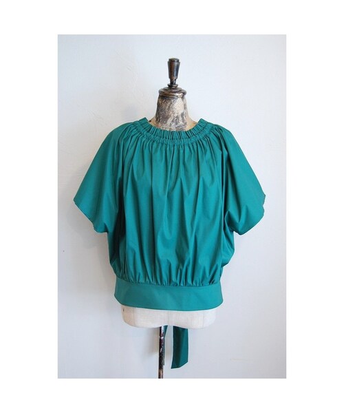 ブランド*カピス カラー*グリーン モデル身長*156cm 首まわりがシャーリングデザインのブラウス。 ふんわりシルエットにバックリボンがアクセント。 また、伸縮性がありオフショルダーとしても着用可。