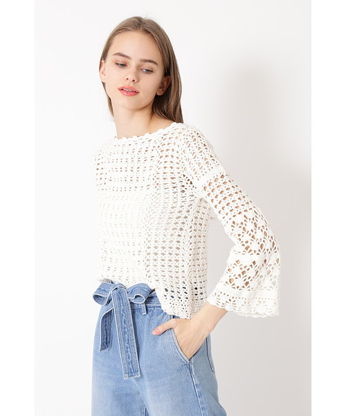 幾何の編み柄を全体的に使い、大人な印象で仕上げた手編みのかぎ針ニット。ベルスリーブの旬な証に加え、短めな着丈が好バランスですっきり整えてくれます。透けて見える袖には、シェルのイメージモチーフを施した特別感のある仕上がりです。後ろをレースアップにしていますが、前後どちらでも着ていただけます。デニムと合わせて、夏らしい大人なカジュアルスタイルがオススメです。