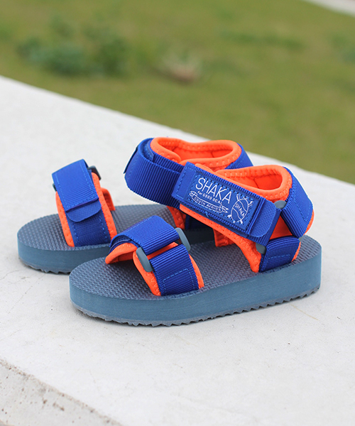 BLACK/GREY・ROYAL/ORANGE/FADE BLUE・FUCHSIA/LAVENDER/GREYはGOOD DEAL別注カラーです。 【NEO BUNGY KIDS】 SHAKAの人気モデルのキッズ版が登場です。 ネオプレンでウェビングテープが直接肌に触れない仕様になっておりますのでウェビングテープの締め付けもデリケートな肌の子供もストレス無く履くことができます。 パパママとお揃いで履いていただきたい1足です。 ●快適な履き心地 90年代当時のソールを基に、軽量化されたソールは、クッション性・耐久性も向上しています。 従来の欧米規格を見直す事で、全体のフィット感が増し、歩行時の負担が軽減されました。 ●高機能をファッショナブルに シンプルなデザインなので、耐久性・快適性に優れたアウトドアアイテムを日常的に楽しめます。 スニーカーとも一線を画す、新たなカジュアル・シューズとしての提案です。 ●もちろんアウトドアにも 水陸両用でお使い頂けるので、海や川でもお使いいただけます。 スニーカーで使用されるEVAミッドソールや、グリップ力・耐久性に優れたアウトソールを採用し、アクティブなシーンにも活躍します。 【 SHAKA / シャカ 】 1990年代に実在した南アフリカ共和国のサンダルブランドです。 南アフリカ国内の自社工場にてハイクオリティーで独創的なデザインのサンダルを製作しておりました。 アフリカの伝統的な柄や色使いを取り入れ、当時のトレンドであったナイロンウェビングを使用したスポーツサンダルは90年代後半に日本でも多く販売されました。 アウトドアブームも追い風となってブランドとして認知されはじめましたが、2000年前半にSHAKAは惜しまれながらブランドが消滅してしまいました。 そして十数年の時が過ぎ、2013年春、遂にSHAKAが復刻となりました。 当時のアーカイブより、SHAKAの特徴であるソールの形状、発色の良いナイロンテープはもちろん、プラスチックパーツや アーチの角度まで忠実に再現する一方、ソールの強度やクッション性、足入れ等の向上をはかり、現代風になった進化版のSHAKAをお楽しみいただけます。 【SIZE】 10 → 15cm 11 → 16cm 12 → 17cm 13 → 18cm 1 → 19cm
