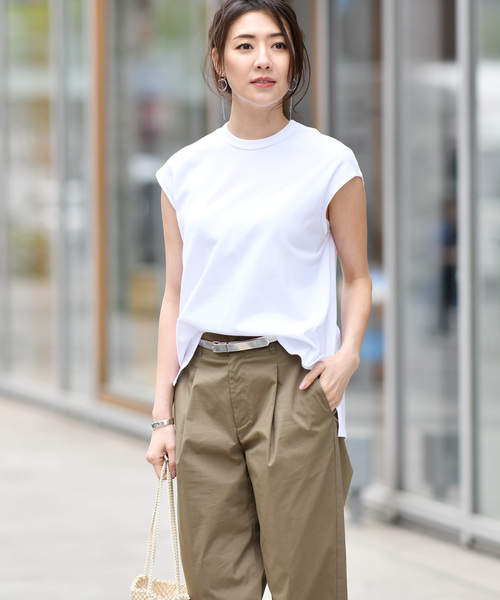 詰まった衿元、スッキリと潔いスリーブレスのデザインで 今っぽくモード感のあるTeeシャツを作りました。 アームホールを少し大きめに作っているので、腕まわりがもたつかず、 すっきりとシャープな印象になっています。 少し肉厚な天竺素材ですので、体のラインを拾わないのもポイントです。 ディティールをそぎ落としたシンプルなデザインですのでお手持ちのボトム合わせやジャケットのインナーとして活用していただきたい1枚です。