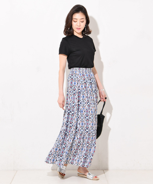 手書きタッチでバティック風オーナメント柄プリントで、4段ティアードのマキシスカートです。ティアードデザインですが、レーヨンコットンの素材で落ち感があるので広がらずに大人が着ても気恥ずかしくないシルエットになっています。スカートの柄のインパクトが強いので、TOPSクルーネックTeeなどをスタイリングして、大人のカジュアルな着こなしがおすすめです。
