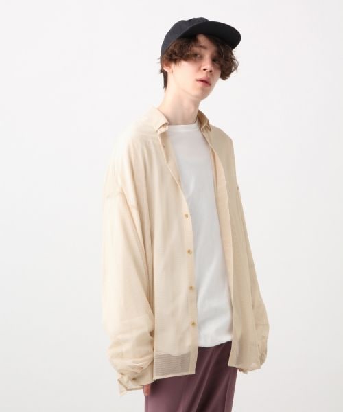 透け感のあるメッシュ素材を使用したルーズフィットシャツ。軽量感、クリア感のあるメッシュ素材を使用し、イージーな雰囲気に仕上げた一枚。オーバーサイズ気味のビッグサイズに仕上げ、ルーズに合わせるスタイリングがおすすめ。フリーサイズなので、全体的に大きく仕上がっています。サイズ表記をご参照ください。