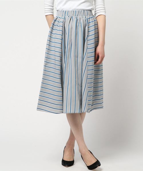 切り替えたミックスストライプがアクセントのストライプスカート。Tシャツやブラウスでまとめると好相性です。 膝下丈で着やすく、裾のフレアー感も女性らしいシルエットになりおすすめの1枚です。 ※裏地付 ※サイドポケット無し