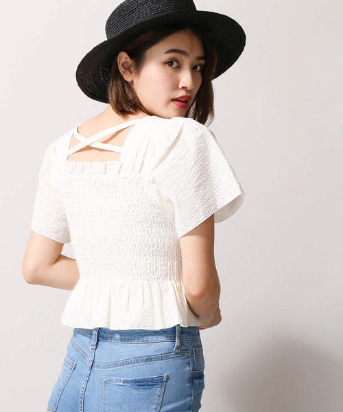 シアサッカー素材で仕上げたブラウス。袖と裾のフリルデザインが、手軽に着こなしのアクセントになります。 ネック周りやウエスト部分にシャーリング加工を施し、さらりとした肌触りで非常に着心地の良いひと品。ショート丈かつ程よくゆとりのあるシルエットで、フェミニンな雰囲気を着こなしに演出してくれます。一枚で着用頂くのは勿論、インナーとしてのアクセント使いもオススメ。 今季はアクセサリーやスニーカーなど、小物で遊びを効かせたコーディネートもオススメです。
