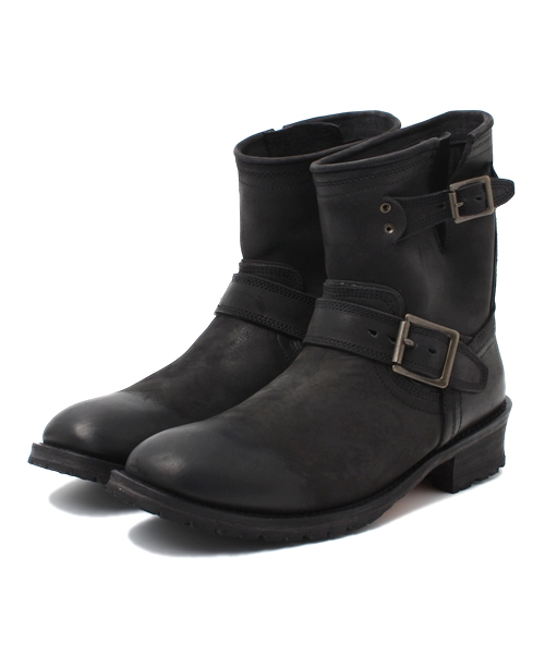NUBUCK(=牛・羊などの表皮を削って毛羽立たせ、ビロードのような質感をもたせた革素材。) エンジニアブーツ(=靴紐は、作業者が足下のモノに紐を引っ掛ける恐れがあるため除外され、替わりにベルトが甲からくるぶしあたりに ついている。ベルトにはバックルが足の外側に配置され、ベルト長さを調整できるようにしている。) 細部にまで拘りをみせたエンジニアブーツです。 goaらしい加工も施されヌバック仕様が一段と味のある風合いを出している。 ※こちらの加工には1点1点に風合いの個体差がございます。