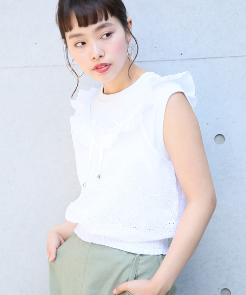 刺繍とフリルが女性らしい♪ 人気のカットワーク刺繍デザインのキャミトップス。 肩のフリルが可愛らしく、前に付いたリボンは結んでも垂らして着て頂いてもOK★ インナーにキャミソールやタンクトップを着て1枚で着て頂いても、下にTシャツを重ねてレイヤードスタイルにしてもかわいいアイテムです♪ ベーシックなオフ、ブラックに加え夏らしいイエローの3色展開になっています。