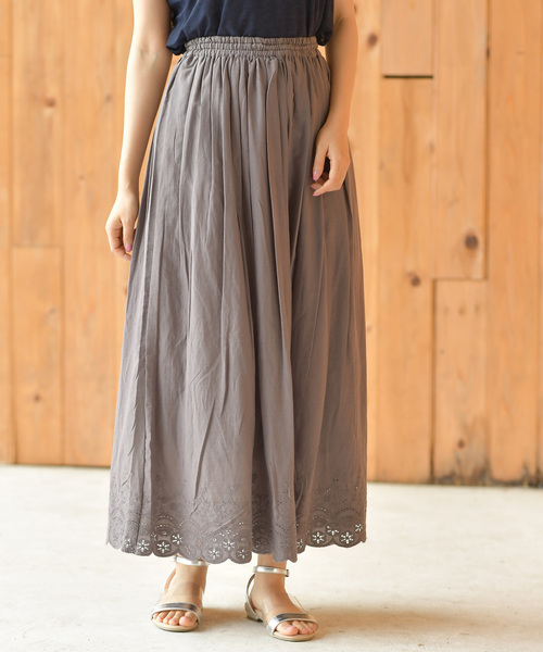 上品で華やぎのある足元を演出するスカラップ刺繍スカート裾にあしらったスカラップ刺繍が足元を女性らしいムードにしてくれるスカート。ヘムカットだから表情もあり華やかな印象を与えてくれます。ふわっと軽やかでさらっとしたコットン布帛が春夏にピッタリなアイテム。裏地もガーゼを使用して、汗ばむ時期も快適にご着用いただけます。ウエストはラフに着られる総ゴムで微妙な調節もできるひも入り。ナチュラルなコーデはもちろん、ブラウスやデザインプルオーバーと合わせてフェミニンな着こなしもお楽しみいただけます。裏地あり伸縮性なし薄手ウエスト総ゴム(紐入り)若干のほつれや糸の飛び出し等みられますこと予めご了承くださいインド生産(インド製品特有の色柄、風合いのため多少の色むら、織りキズ等は商品の特徴の一つですので、予めご了承ください)洗濯:洗濯機使用可・裏地有り。