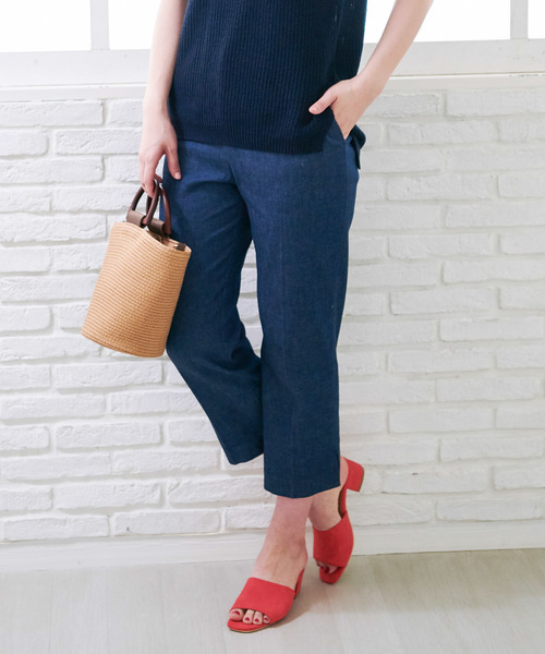 デザイン性のあるトップスにマッチ。機能素材で快適な穿き心地をキープします。ROPE’ SISTER'S PROJECT VOL.350TH SPECIAL COLLECTION directed by Naoko Tsujiロペ誕生 50 周年を機に発足したロぺ・シスターズ・プロジェクト第三弾では、雑誌はもちろん幅広いジャンルで活躍中のスタイリスト「辻直子氏」ディレクションによる スペシャルコレクションを、3姉妹ブランドのロペ、アダム エ ロペ、ロペピクニックから発売!UVケア、接触冷感、吸水速乾性を備えた機能素材「ミリオンアイス(R)」を使用したデニムパンツです。デニムながら暑い夏にも快適に着用できる、こだわりのアイテムとなっています。すっきりと着られる細身のストレートラインで、カジュアル感を抑えたエレガントなスタイルにもフィット。軽快なクロップド丈は、合わせるシューズを選びません。【million ICE(R)】UV Care・特殊レーヨンとポリエステルにミネラル成分を練りこむ事で、繰り返しの洗濯でも優れた紫外線遮蔽効果を持続します。(紫外線遮蔽率80%以上)Cooling・肌に触れるとヒンヤリ涼しく感じる接触冷感素材を使用しています。Quick Dry・特殊断面ポリエステルを紡績することにより汗を素早く拡散させ、優れた吸汗速乾性能を実現しました。Washable Wear・本品は家庭で気軽にお洗濯できるウォッシャブルウエアです。洗い方に関しては、必ず、洗濯表示に従ってお洗濯していただく様にお願いします。