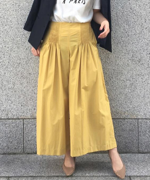 スタイリングに上品なこなれ感をプラスするフレアパンツ。ウエスト部分に施したタックが、ボリュームのあるシルエットをすっきりと引き締めます。バックウエスト部分はゴム仕様で、ストレスフリーな履き心地も魅力的。ウエストインにしでプリーツを魅せるスタイリングがおすすめです♪・ファスナー有り。