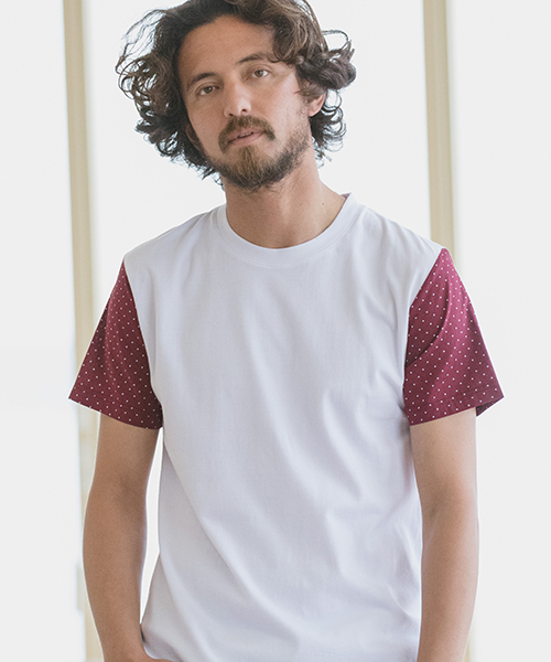 181cm 66kgのモデルがMサイズを着用40/2天竺(細い糸を双糸で編み込んだ天竺生地)使用の品質にも拘った1着。※双糸は光沢感を生み、単糸より長く斜傾せず品質をキープしてくれます。デザイン性は両袖のみシャツ生地に切替えた個性あるデザインが目を惹くアイテムです。※着用画像と商品単体画像で色が異なる場合がございます。※商品単体画像を実物により近づけております。