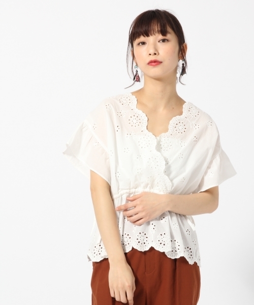 大人気!!スカラップ刺繍デザインブラウス今季注目のカシュクールデザインのブラウス。人気のスカラップ刺繍仕様になっており、1枚で女性らしいブラウスになっています。ウエストには同素材のヒモがあるので、お好みでキュっと絞って調節して頂けます♪ゆったりめのシルエットなので、タイトスカートやデニムなどとの相性GOODです!!