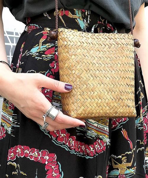 ナチュラルなスタイリングにピッタリなショルダーバッグ。ショルダーストラップをとめた左右のコロンとした木のビーズがアクセントになっています。口がファスナーで閉まるので、貴重品を入れても安心なデザインです。肩紐は長めにデザインされているので、お好きな長さで結んで調整できます。