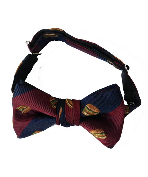 TIEDNISTA.(タイドニスタ)のシルクジャガード蝶ネクタイ。 ポップなデザインはすべて、ジャガードに折り込まれたもの。 プリントにはない高級感と重厚感があります。 ネクタイ用シルク生地のルーツである西陣織の里、京都のシルクジャガードを使用。 縫製も、国内の職人が昔ながらの手作業で1つ1つ仕上げたもので、ラインの美しさや耐久性、締めやすさなど、大量生産の工業製品とは一線を画すクオリティ。 デザインから縫製まで、一貫して日本国内で行っている正真正銘のMade in Japan製品です。 落ち着いたカラー使いの太目のストライプに、ハンバーガーのモチーフ。 カジュアルな中にも上品さが漂う、大人の蝶ネクタイ。 成形されていて、フックで留めるだけの簡単仕様。 首回りの長さ調節もOK。 スタイル名:Humberger Stripe(ハンバーガー・ストライプ) サイズ:蝶部分 11cm × 6.5cm 長さ(首回り)最長43cm 日本製 ※ギフトBOX着き。