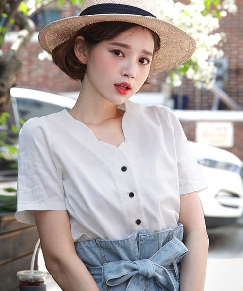リネン55%綿45%混紡のボタンブラウスで首元が波打つ愛らしい一枚に♪ スカラップ×Vネックで甘く上品なスタイル!半袖ですっきり洗練* ※WEARに記載してある金額と、DHOLIC通販サイトに記載してある金額にシステム都合上、稀に誤差が生じます。正しい金額はDHOLIC通販サイトに記載された金額です。