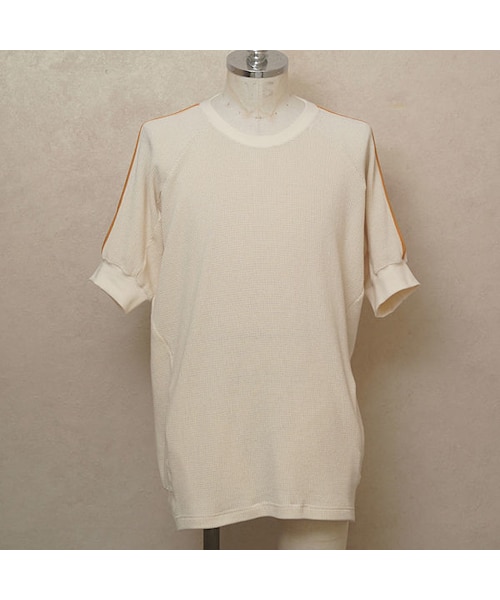 20双糸のざっくり畦組織のニット素材でラグランスリーブのT-シャツ。肩のラインにサテンのバイアステープで付け、スポーティーかつスタイリッシュに仕上げました。 ニットの様な素材感+綿素材なので、上品かつデイリーに使えるITEMです。 ちゃんと腰PKも有ります!!!
